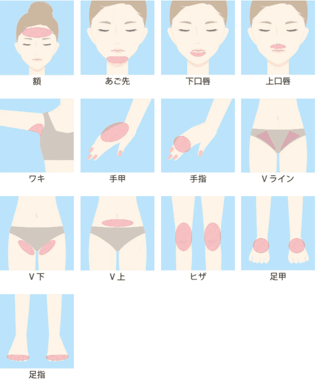 ワキ/Vライン/V下/V上/ヒザ/ 手甲/手指/足甲/足指/上口唇/下口唇/あご先/額