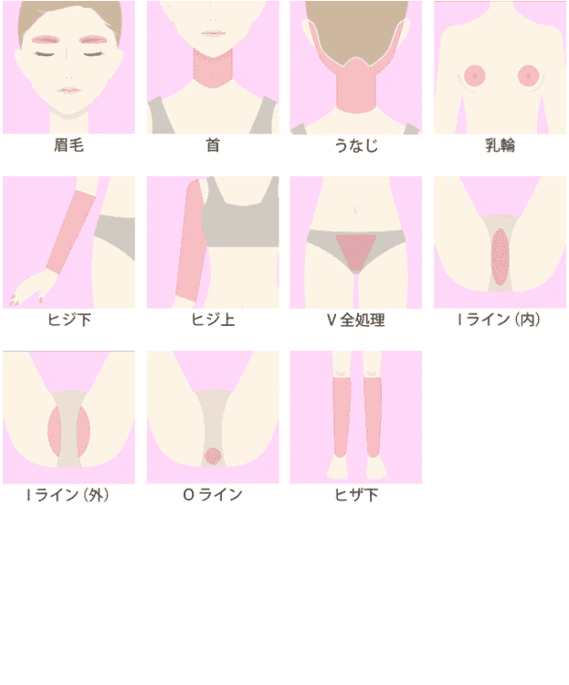 Iライン周囲/Iライン内側/Oライン周囲/ヒザ下/ヒジ下/ヒジ上/乳輪周囲/眉毛/首/うなじ