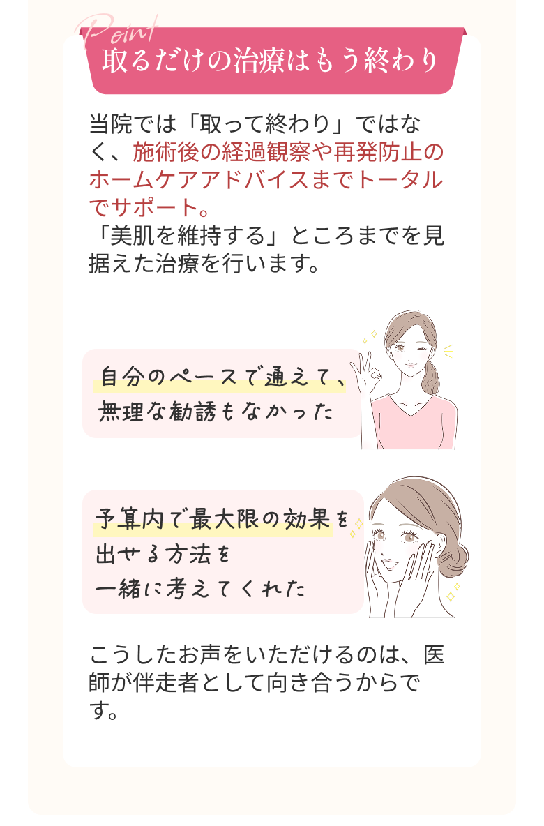 「なぜそのシミができたのか」「どの治療が最適なのか」をしっかりご説明します。急いで施術して効果が出ないより、最初にしっかり診断することが、結果への最短ルートです。