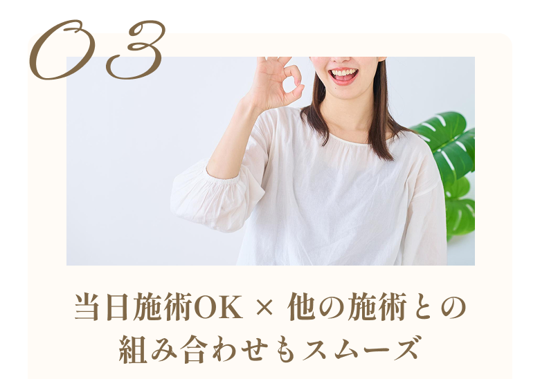 また、シミ取り、ニキビ治療、ヒアルロン酸・ボトックスなど、他の美容施術との組み合わせもスムーズに対応します。