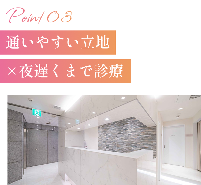 当院は駅から徒歩圏内のアクセスしやすい立地にあり、お仕事帰りやお買い物のついでにも通いやすい環境です。