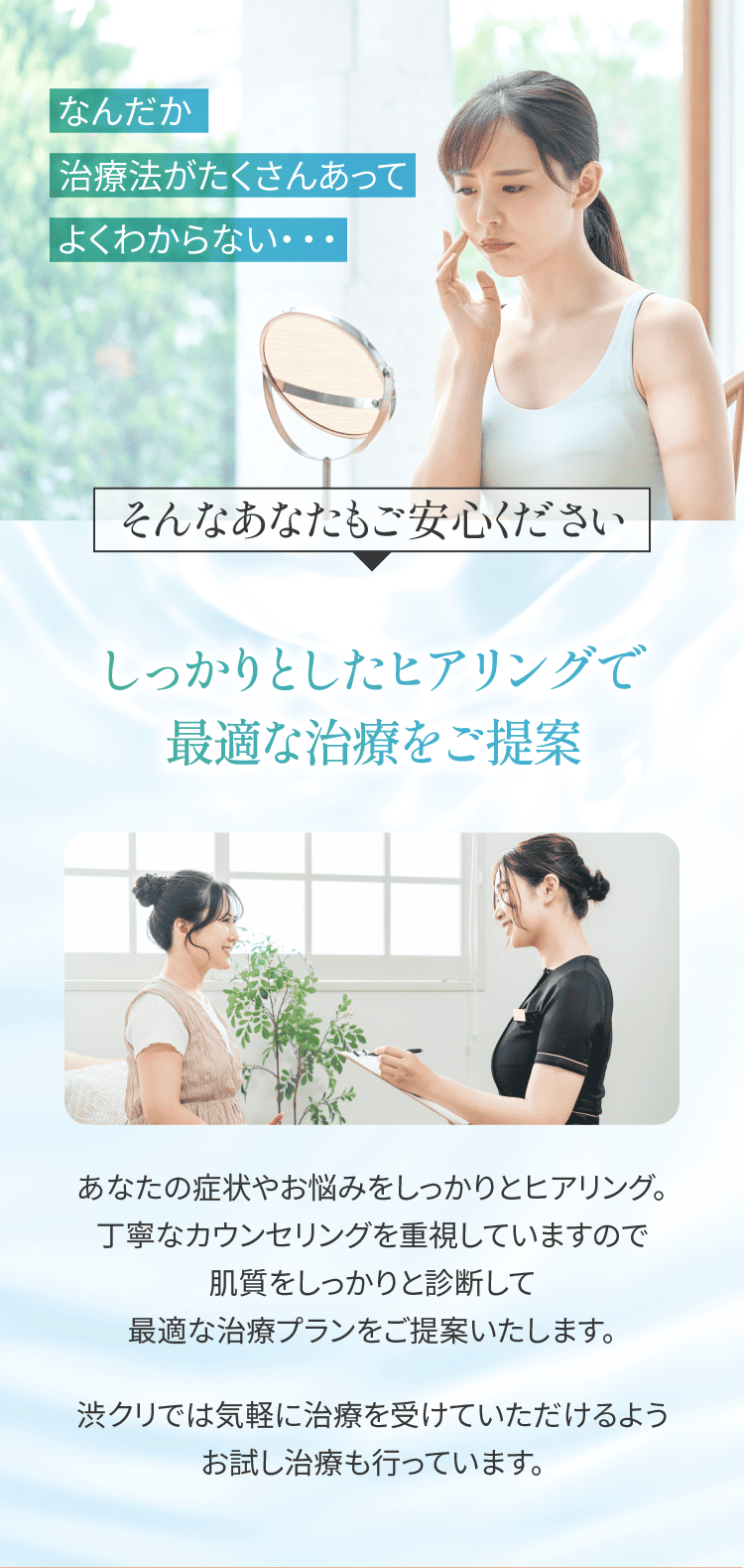 渋クリは独自のノウハウで患者様お一人おひとりに最適な施術、最新機器での治療をご提案いたします