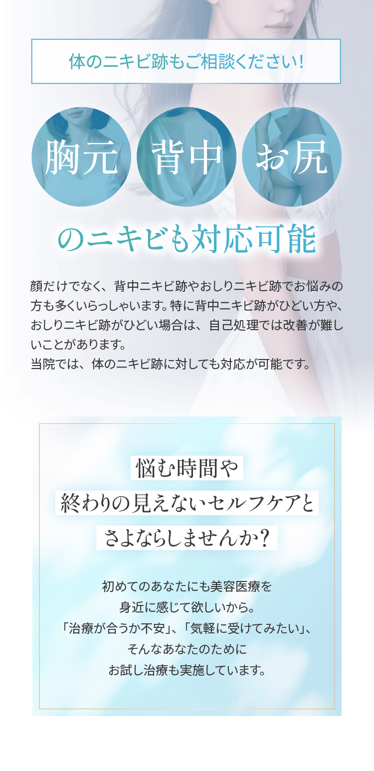 顔だけでなく、背中ニキビ跡やおしりニキビ跡でお悩みの方も多くいらっしゃいます。特に背中ニキビ跡がひどい方や、おしりニキビ跡がひどい場合は、自己処理では改善が難しいことがあります。当院では、体のニキビ跡に対し