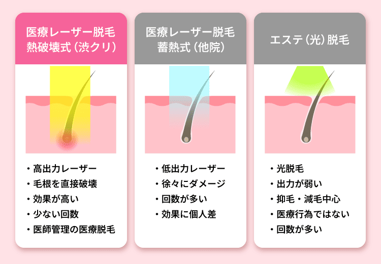 太い毛~産毛までの毛質、敏感肌やアトピー・アレルギー体質による見極めがデリケートな肌質など、渋クリは美容皮膚科ならではのノウハウを駆使することで、あらゆる患者様の毛質や肌質に対して、脱毛が可能です。