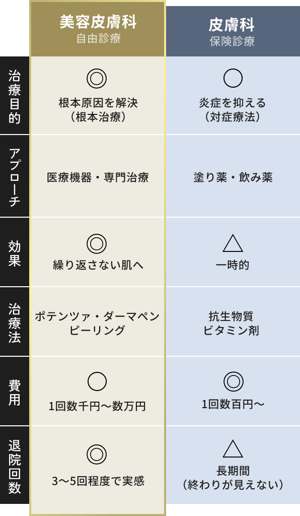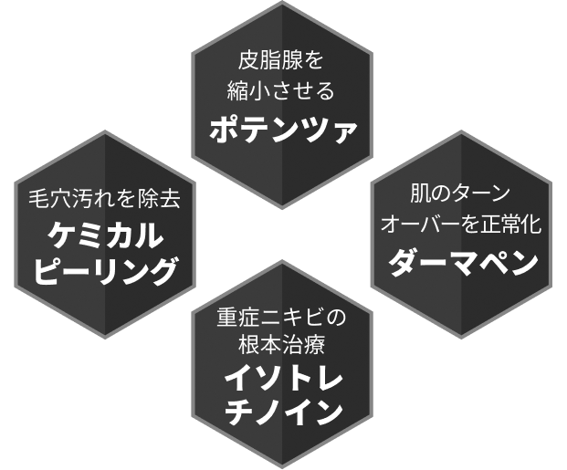 保険診療では、「今ある炎症を抑える」ことしかできません。塗り薬や抗生物質では、皮脂腺の大きさ、毛穴の詰まりやすさ、肌質そのものは変えられないのです。