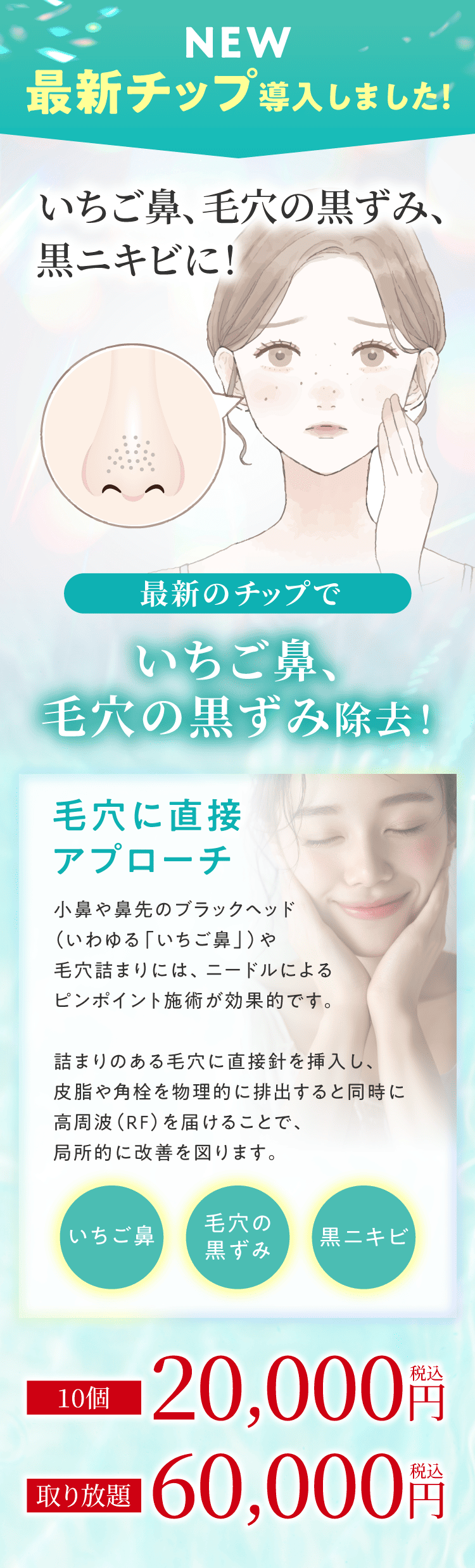 渋クリでは、ポテンツァのチップを衛生・効果上、一回の使用で破棄しているため、部分施術ではなく顔全体での施術をご提供しております。