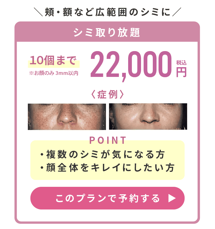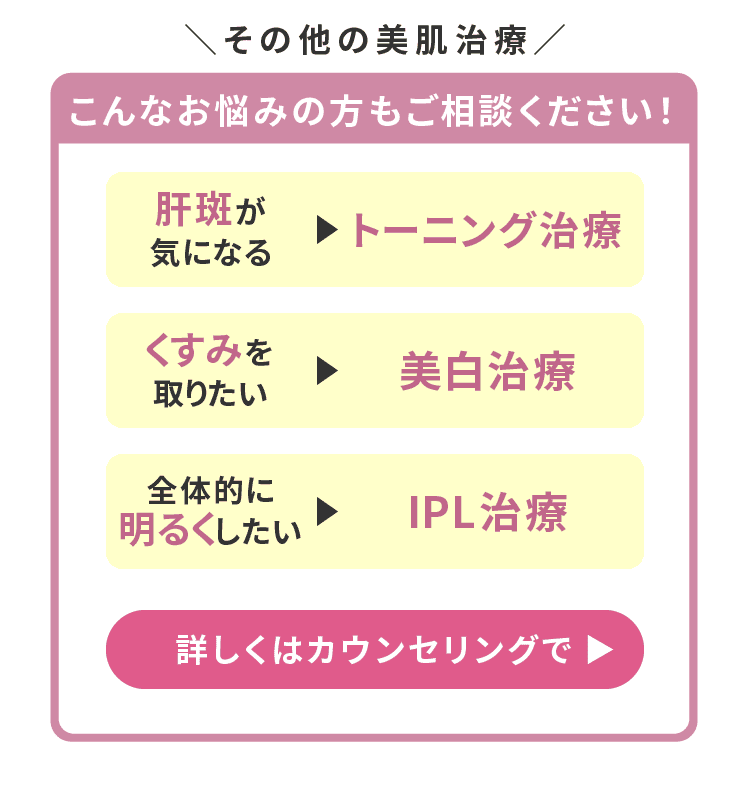 渋クリでは、シミだけでなく、肝斑やくすみも併発している場合でも対応できる豊富な治療メニューを取り揃えております。お気軽にご相談ください。