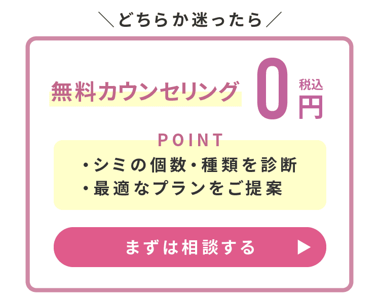 レーザーの種類やシミの状態によって痛みは異なり、個人差がありますが、ゴムでパチンとはじく程度の痛みを感じる場合があります。麻酔なしでもできる治療ですが、ご心配な方は塗る麻酔薬や笑気麻酔もございますのでカウンセリング時にご相談ください。