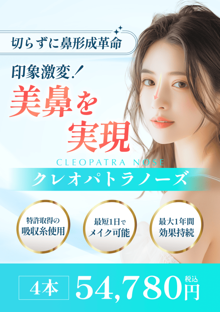クレオパトラノーズは、特許取得済みの吸収糸を巧みに挿入することで、切らずに立体感を生み出すことができる自由度の高い鼻の形成施術です。